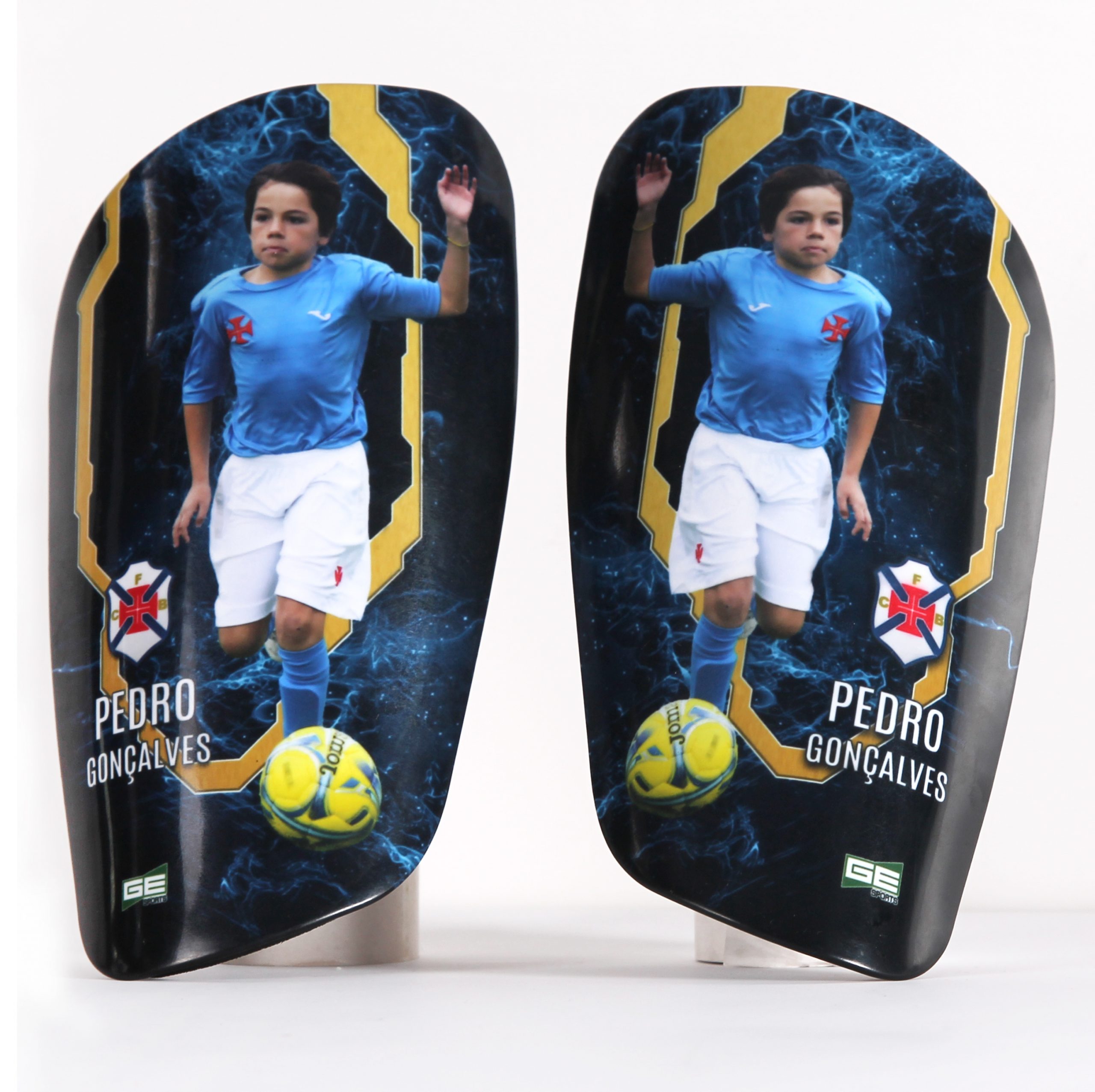 Caneleiras com o logo e as cores do clube, o nome e número do jogador e 4 fotos escolhidas pelos atletas.